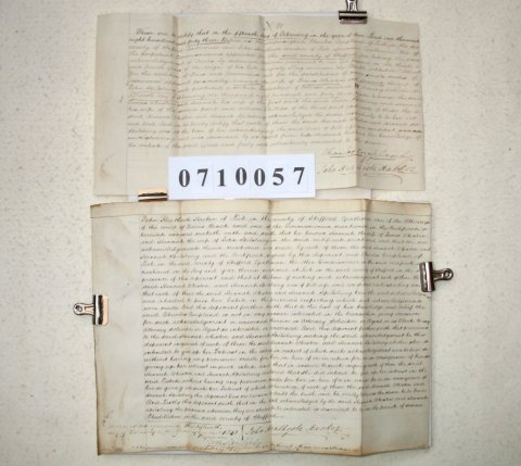 The property is in Cheddleton in the County of Stafford, and was either sold or mortgaged on 15 February 1843. The document was sworn before Two of the perpetual Commissioners appointed for taking the acknowledgments of Deeds by Married Women in Leek, Staffordshire. | ||||||||||||