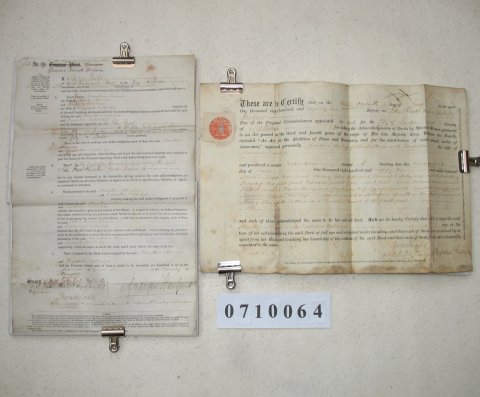 | This ORIGINAL document is a standard certificate which arises from the sale or mortgage of property which had belonged to a married woman. At this period (ie after 1833 but prior to the Married Women's Property Act of 1882) any property of a married woman passed immediately to her husband. As some sort of safeguard she would be examined by a commissioner appointed for the purpose who would satisfy himself that she was of full age and understood what was going on. The document is signed by the commissioner, but not by either the husband or wife. It gives the parish in which the property is located and date of the transaction, but no further detail. | ||||||||||||||