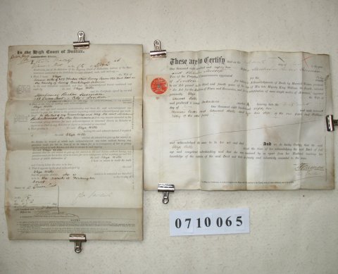 | This ORIGINAL document is a standard certificate which arises from the sale or mortgage of property which had belonged to a married woman. At this period (ie after 1833 but prior to the Married Women's Property Act of 1882) any property of a married woman passed immediately to her husband. As some sort of safeguard she would be examined by a commissioner appointed for the purpose who would satisfy himself that she was of full age and understood what was going on. The document is signed by the commissioner, but not by either the husband or wife. It gives the parish in which the property is located and date of the transaction, but no further detail. | ||||||||||||||