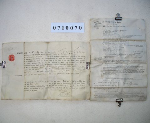 | This ORIGINAL document is a standard certificate which arises from the sale or mortgage of property which had belonged to a married woman. At this period (ie after 1833 but prior to the Married Women's Property Act of 1882) any property of a married woman passed immediately to her husband. As some sort of safeguard she would be examined by a commissioner appointed for the purpose who would satisfy himself that she was of full age and understood what was going on. The document is signed by the commissioner, but not by either the husband or wife. It gives the parish in which the property is located and date of the transaction, but no further detail. | ||||||||||||||