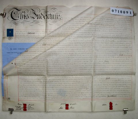| Parchment : 3 sheets 63cm x 80cm with 8 wax seals, 6 signatures and revenue stamps. A second indenture of 1859 has been added on the back of the third sheet. | ||||||||||||