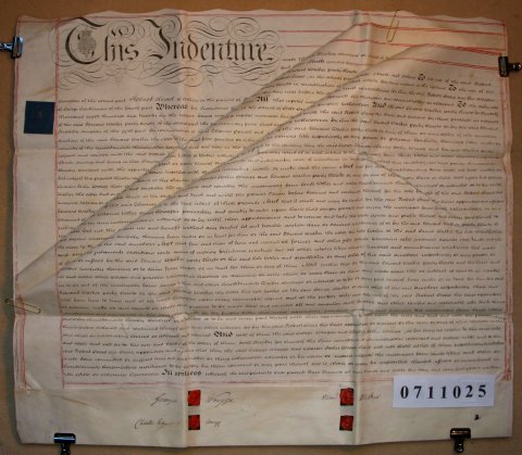 | Parchment : 3 sheets 61cm x 70cm with 4 wax seals, 3 signatures and revenue stamps | |||||||||||||