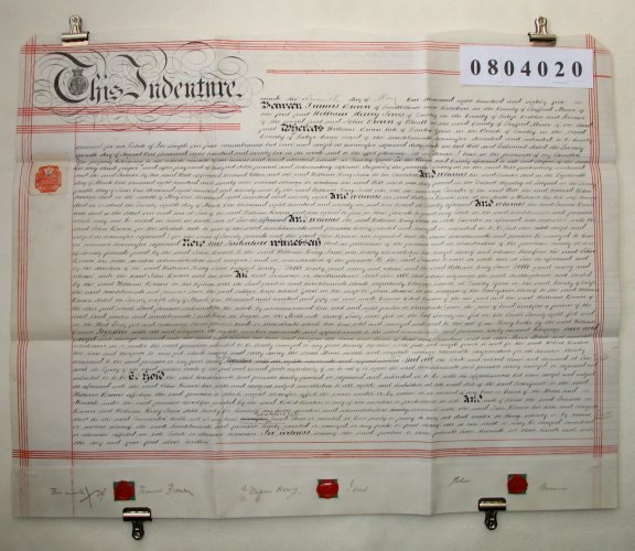 | Parchment : 1 sheet 53cm x 66cm with 3 wax seals, 3 signatures and revenue stamp. | ||||||||||||
