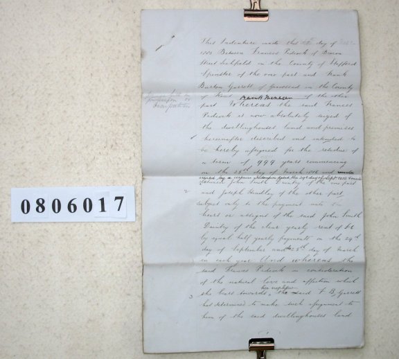 Frances PIDCOCK of Beacon Street, Lichfield, Staffordshire. Spinster. Frank Burton GARRETT of Gravesend, Kent. Bank Manager. SUBJECT Frances Pidcock owns the residue of a 999 year lease on 6 houses in Buxton Road, Macclesfield, subject to a ground rent of £6 per annum. She is assigning his lease to her nephew, Frank Garrett, "out of the natural love and affection" which she bears towards him. | ||||||||||||||