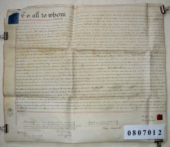 | Parchment : 1 sheet 60cm x 50cm with 1 wax seal, the signature mark of Thomas James, and revenue stamp. | ||||||||||||||