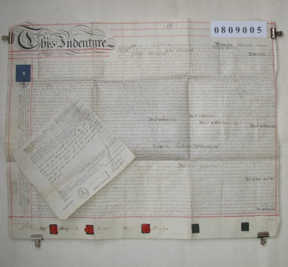 | Parchment : 1 sheet 71cm x 58cm with 3 wax seals, 3 signatures and revenue stamp. Also a smaller piece 24cm x 23cm. | ||||||||||||