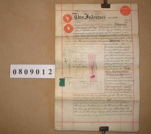 | Parchment : 2 sheets 27cm x 42cm with 1 wax seal, signature, revenue stamps and plan of the property. | |||||||||||