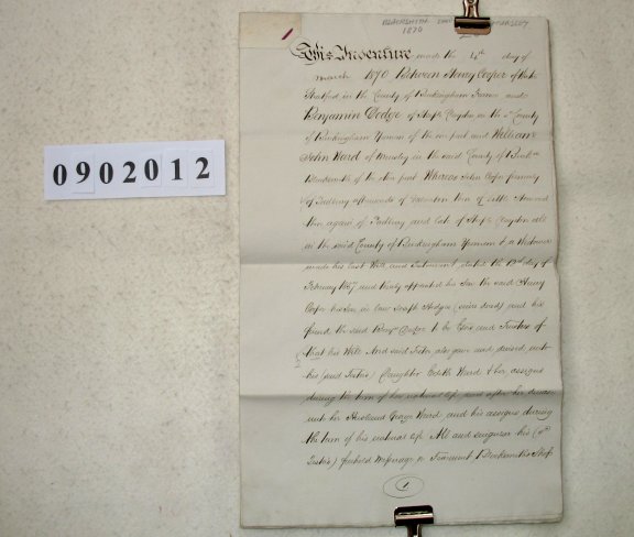 Henry COOPER of Water Stratford, Buckinghamshire. Farmer. Benjamin DODGE of Steeple Claydon, Buckinghamshire. Yeoman. William John WARD of Mursley, Buckinghamshire. Blacksmith. John COOPER (deceased) of Padbury, Buckinghamshire. Yeoman. SUBJECT The document begins by reciting the Will of John COOPER who died in 1860 having appointed Henry COOPER (his son) and Benjamin DODGE as executors and trustees of his Will. In his Will he left property to his daughter Edith WARD and her husband George WARD during their lives, and afterwards to his trustees to be sold. Edith and George WARD both died in 1869, and the trustees are now selling a Blacksmith's Shop in Mursely, Buckinghamshire, to William John WARD for £200. This document is only a draft and there can be no certainty that the sale actually took place. However, all the details such as precise date and amount of stamp duty have been filled in, suggesting that it was completed. | ||||||||||||