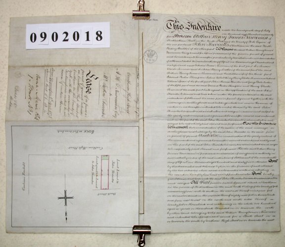 | Paper : 4 sheets 37cm x 24cm with 2 signatures, revenue stamp, and small outline of the property. | ||||||||||||