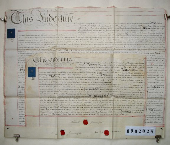 | Parchment : 2 sheets of which the largest is 63cm x 78cm with 3 wax seals, 3 signatures and revenue stamps. (2 indentures together). | |||||||||||