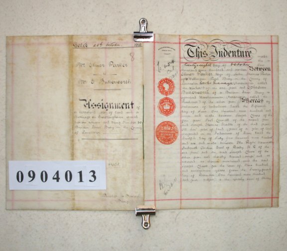 Elinor PARKER of Bury, Lancashire, the wife of John Thomas PARKER, Works Manager. Ephraim BUTTERWORTH of Bury, Lancashire. Warehouseman. SUBJECT Elinor Parker is selling the residue of a 999 year lease on property in Bury, Lancashire, to Ephraim Butterworth for £250. The property consists of a house at No 30 Britain Street, Bury, for which the original 999 year lease was created in 1906. This lease came into the hands of John Parker in 1911. | ||||||||||||