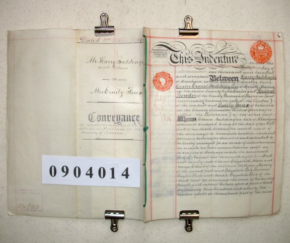 Harry SADDINGTON of Measham, Leicestershire. Cattle Dealer. Ernest SADDINGTON of Appleby Magna, Leicestershire. Cattle Dealer. Richard BOWKER of Burton on Trent, Staffordshire. Gentleman. Emily FAUX of Coleorton, Leicestershire. Widow. Edwin SADDINGTON (deceased) of Measham, Leicestershire. SUBJECT The document begins by reciting that Edwin Saddington died in March 1915 having appointed Richard Bowker and Harry and Ernest Saddington as trustees of his will. These trustees are now selling property in Measham, Leicestershire, to Emily Faux for £490. The property consists of two messuages known as Red Bank Villas adjoining the Atherstone and Burton turnpike road. | ||||||||||||