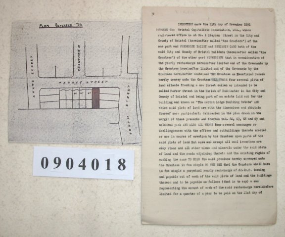 The Bristol Capitalists Association Ltd Frederick BAILEY of Bristol, Gloucestershire. Builder. Benjamin GAGG of Bristol, Gloucestershire. Builder. SUBJECT The Bristol Capitalists Association is granting property in Bristol to Frederick Bailey and Benjamin Gagg in return for a ground rent of £10 per annum. The property forms part of The Ashton Lodge Building Estate in a new street called Parker Street in the Parish of Bedminster, Bristol. It consists of 4 building plots with 4 dwelling houses then in the course of construction by Frederick Bailey and Benjamin Gagg. This is actually a carbon copy of a typed original. | ||||||||||||