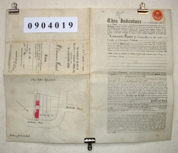 James Wilson HOLME of 34 Old Jewry, City of London. Esquire. Henry John BIRCH of Friars, Chester, Cheshire. Esquire. Robert Francis Lascelles JENNER (d) of Wenvoe Castle, Glamorgan. Esquire. Laura Frances JENNER of Wenvoe Castle, Glamorgan. Widow. Edmund MAYLED of Dinas Powis, Glamorgan. Carpeneter. SUBJECT We are told that James Holme and Henry Birch are trustees of the Will of Robert Lascelles Jenner. In this capacity they are granting a lease on property in the Parish of Cadoxton, Glamorgan, to Edmund Mayled. Laura Jenner comes into it to the extent that she needs to give her consent. The lease is for 91 years at a rent of £2/10/-d per annum and is for a dwelling house with stable in Newlands Street, Cadoxton. The document is for the most part printed, but with manuscript insertions where they relate to this particular property and lessee. | ||||||||||||
