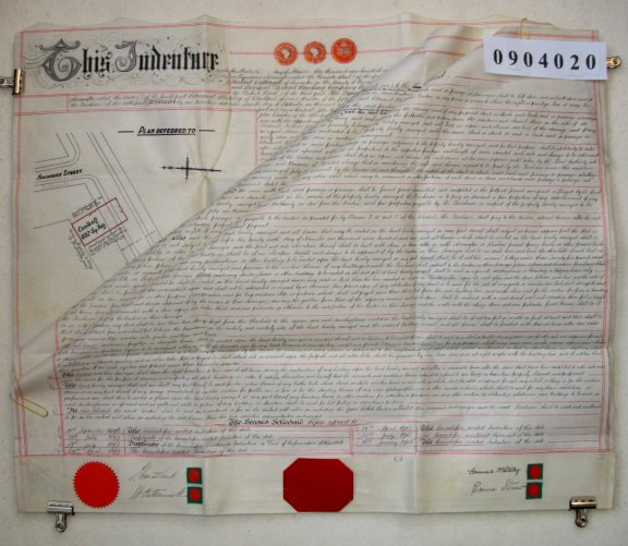 | Parchment : 3 sheets 69cm x 56cm with various seals, 4 signatures and revenue stamp. Includes plan of the property | ||||||||||||