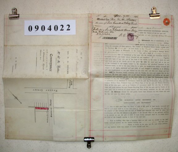 Reginald MacKenzie MERCER, Canterbury, Kent. Gentleman. William Henry RETTER of Whitstable, Kent. Draper. SUBJECT Reginald Mercer is selling property in Whitstable to William Retter for £22/6/-d. it consists of a plot of land of 14 feet x 97 feet in Warwick Road, with no mention of any house built on it. However, there is a receeipt attached, of the same date, for £260 which says that it is "Including Land and Freehouse House being number 1 Warwick Road". The document is printed with manuscript inserts in the blanks. | ||||||||||||
