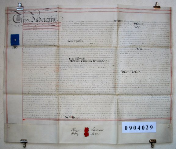 | Parchment : 1 sheet 59cm x 75 cm with 2 wax seals, 2 signatures and revenue stamp. | ||||||||||||