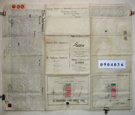 | Parchment : 1 sheet 72cm x 70cm with 1 wax seal, 1 signature and revenue stamp. A second Indenture of 1895 has been added on the back together with plans of 2 plots of land. | |||||||||||