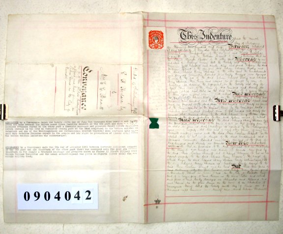 Edward Henry HODSON of Farquhar Road, Edgbaston, Birmingham (Manufacturer) Clara Caroline BENNETT the wife of William Bennett of St Nicholas Street, Worcester. (Builder) SUBJECT The document relates to 3 pieces of land totalling 427 square yards with 3 dwelling houses in Severn Terrace, Worcester, part of a larger piece of land known as Jews Patch. We are told that William Bennett acquired this property in June 1899 and mortgaged it to Edward Hodson for £675 in October of the same year. William Bennett has since defaulted on the mortgage with the full amount still outstanding. Edward Hodson is now exercising his right to sell the property to Clara Bennett for the £675. Memoranda added on the back mention the sale of 2 of these houses (numbers 13 and 15 Croft Villas) in 1947 and 1951. | ||||||||||||