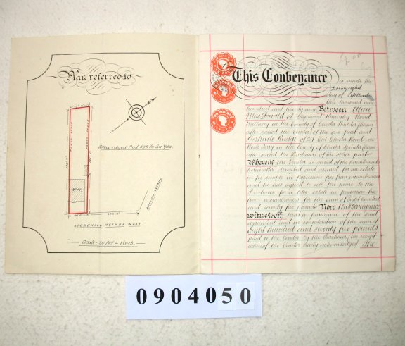 | Parchment : 22cms x 27cms 5 pages includng cover, closely handwritten, Signed and Sealed with Revenue Stamp. Scale Plan on inside cover. | ||||||||||||