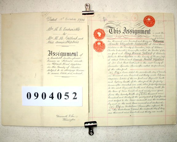 Maude Elizabeth ENTWISTLE of School House, Woolston, Lancashire (the wife of William Charles Entwistle) Mary Maria GILBERT of Belsaila, Hillside Road, Appleton, Cheshire (the wife of Albert Gilbert) Annie Isobel HIPKISS of 301 Lord Street, Southport, Lancashire. (Spinster) SUBJECT The document relates to a semi-detached house "Belsaila" in Hillside Road, Appleton, Cheshire. A 999 year lease on the land had been created in 1930 and then William Hipkiss acquired an underlease in 1931, mortgaging it for £400 two days later. He died intestate in 1936 with Maude Entwistle being appointed as his personal representative. Maude Entwistel is now selling the property to Mary Gilbert and Annie Hipkiss for £120 and these two will take over the £400 mortgage which is still outstanding. | ||||||||||||