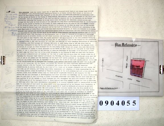 | Paper : 30cms x 40cms, 3 single sided typewritten sheets (carbon copies) plus cover sheet, plan attached shaded pink | |||||||||||