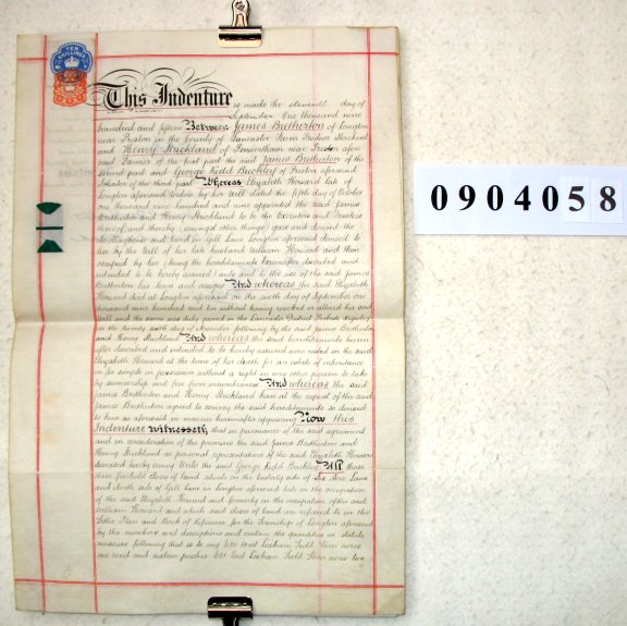 Elizabeth HOWARD (deceased) late of Longton near Preston, Lancashire. (Widow) James BRETHERTON of Longton near Preston, Lancashire. (Farm Produce Merchant) Henry STRICKLAND of Penwortham near Preston, Lancashire. (Farmer) George Kidd BUCKLEY of Preston, Lancashire. (Solicitor). SUBJECT The document begins by reciting that Elizabeth Howard died in 1910 having appointed James Bretherton and Henry Strickland as her Executors & Trustees. We are also told that the property involved came to her via the Will of her husband, William Howard, and is now in the hands of her Trustees for the ultimate benefit of the same James Bretherton. Accordingly, the Trustees are now conveying it to George Buckley in trust for James Bretherton. The property consists of 3 closes of land in Longton,, Lancashire, totalling 7 acres laying on the East Side of Six Acre Lane and on the North Side of Gill Lane. A dwellinghouse built by William Howard is included. | |||||||||||
