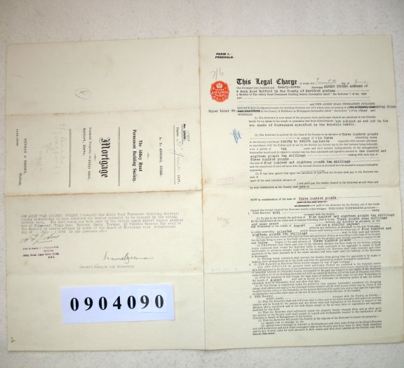 Albert Hughes ADSHEAD of 9 Park Road, Watford, in the County of Hertfordshire (Postman) The Abbey Road Permanent Buildig Society SUBJECT Albert Adshead is mortgaging property known as Ridgemont in Ridge Lane, Watford, Hertfordshire, to the Abbey Road Building Society for £300. A note added on the back records that the mortgage had been repaid by July 1929. | ||||||||||||