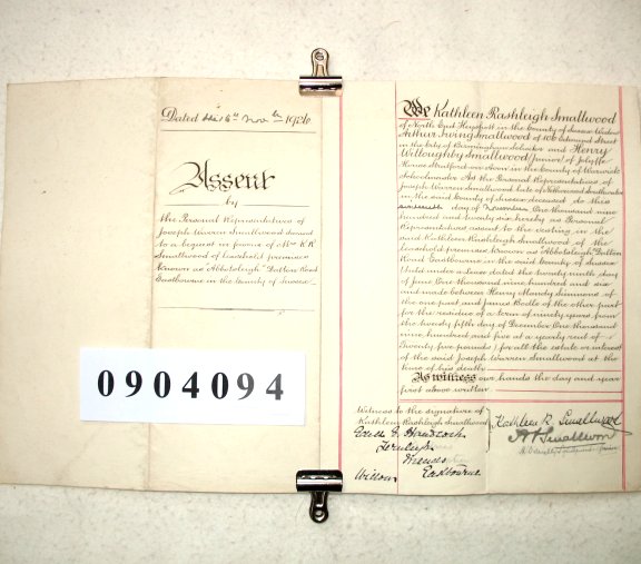 Kathleen Rashleigh SMALLWOOD of North End, Heyshott, Sussex. (Widow) Arthur Irving SMALLWOOD of 106 Edmund Street in the City of Birmingham. (Solicitor) Henry Willoughby SMALLWOOD Junior of Jolyffe House, Stratford on Avon, Wariwckshire. (Schoolmaster) Joseph Warren SMALLWOOD (deceased) Southwater, Sussex SUBJECT Assent by the Personal Representatives of Joseph Warren SMALLWOOD deceased to a bequest in favour of Mrs Kathleen Smallwood of leasehold premises known as Abbotsleigh, Dalston Road, Eastbourne in the County of Sussex. The summary and description of this document are being processed and will appear as soon as possible. If you wish to know details in the meantime, please contact familychest@aol.com by email and we will respond by return. | ||||||||||||