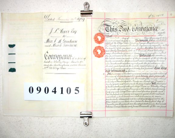 John Liddle CARR of 24 College Drive, Whalley Range, Manchester, Lancashire (Electrical Engineer) Anna Martha GOODACRE and Emily GOODACRE both of 3 Demesne Road, Whalley Range, Manchester (Spinsters) SUBJECT Conveyance of a plot of land in Whalley Range, Manchester, and of the dwelinghouse erected thereon number 24 College Drive. The summary and description of this document are being processed and will appear as soon as possible. If you wish to know details in the meantime, please contact familychest@aol.com by email and we will respond by return. | ||||||||||||