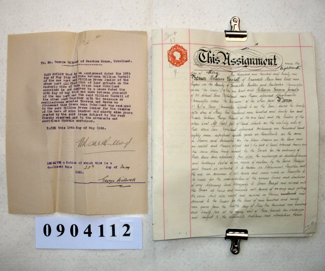 William GASKELL of Bruardale, Moss Road, Orrell, Near Wigan, Lancashire. Builder & Contractor. William BROWN Junior of 67 School Lane, Upholland, Near Wigan, Lancashire. Schoolmaster. George WILCOCK of Seaview House, Upholland, Lancashire. SUBJECT The document relates to a plot of 1080 square yards together with a house called Claremount, erected by the vendor, in Wide Cross Lane, Upholland. We are told that a 999 year lease was granted to William Gaskell on this property in May 1925. He is now selling the residue of the lease to William Brown for £672. The typescript note is to notify George Wilcock the owner of the freehold, of the assignment of the lease. | ||||||||||||