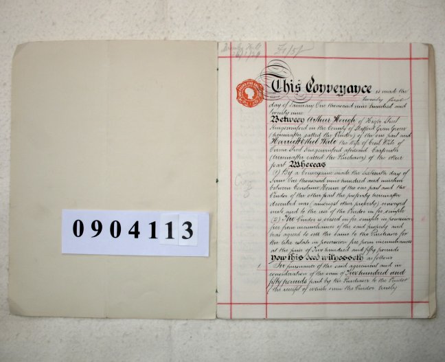 Arthur HOUGH of High Street, Kingswinford, Staffordshire. (Green Grocer) Harriett Ethel WALE the wife of Cecil WALE of Queen Street, Kingswinford, Staffordshire. (Carpenter) SUBJECT Arthur Hough is selling property in Kingswinford, Staffordshire, to Harriett Wale for £250. It consists of 2 dwellinghouses at numbers 19 and 19a Water Street, which were acquired by the vendor in 1919. A Schedule to the document lists other indentures relating to this property going back to 1849. | ||||||||||||