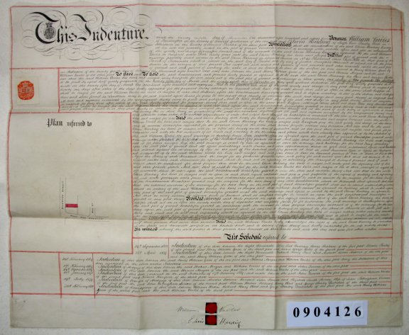 | Parchment : 1 sheet 71cm x 59 cm with 2 wax seals, 2 signatures, revenue stamp and plan | |||||||||||