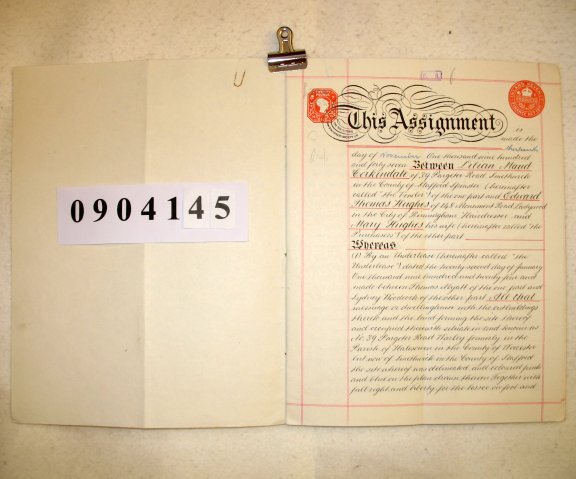 Lilian Maud CORKINDALE of 39 Pargeter Road,Smethwick, Staffordshire. (Spinster) Edward Thomas HUGHES of 148 Monument Road, Ladywood, Birmingham (Hairdresser) and his wife Mary HUGHES SUBJECT We are told that in 1938 Lilian Corkindae acquired an underlease on property in Smethwick for the residue of a term of 99 years which had begun in 1911. She is now selling the underlease to Edward and Mary Hughes for £1600. We arre told that these two will hold the property in trust to sell it at some future date (but we are told told who is the beneficiary of that trust). The property consists of a dwellinghouse at number 39 Pargeter Road, Smethwick. | |||||||||||
