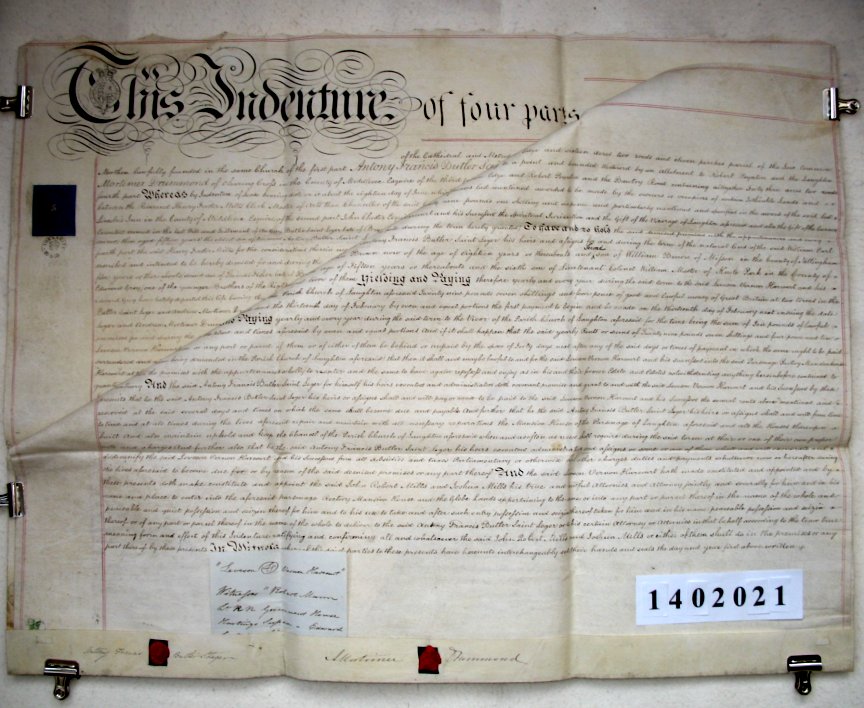The Rev. Leveson Vernon HARCOURT Chancellor of York Cathedral and Prebendary of Laughton-en-the-Morthen Antony Francis Butler SAINT LEGER of Chicheley, Bucks - Esquire Andrew Mortimer Drummond of Charing Cross, Niddlesex - Esquire John Robert MILLS of the City of York, Yorkshire - Gentleman Joshua MILLS of the City of York, Yorkshire - Gentleman SUBJECT The document begins by telling us that in 1823 a lease on property in Laughton-en-the-Morthen was granted for the duration of 3 lives. Two of the lives named have since died and Antony St. Leger and Andrew Drummond have obtianed a new lease from the Rev. Harcourt for a further 3 lives. The property consists of: 1. The Rectory of Laughton-en-le-Morthen with the Glebe Lands and Thithes due to it. 2. Land allotted by the Enclosure Commissions for Laughton in 1769. 3. Land allotted by the Enclose Commission for Dinnington in 1778. 4. Various money payments in lieu of tithes. The Rev. Harcourt appoints John and Joshua Mills as his attornies to enter into the property, obtain possession and seizin thereof and deliver it to Antony St. Leger. Evidently this is merely a legal formality. | |||||||||||