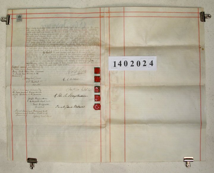 | Parchment : 2 pages 31cm x 47cm with 5 wax seals, 5 signatures and revenue stamps | |||||||||||