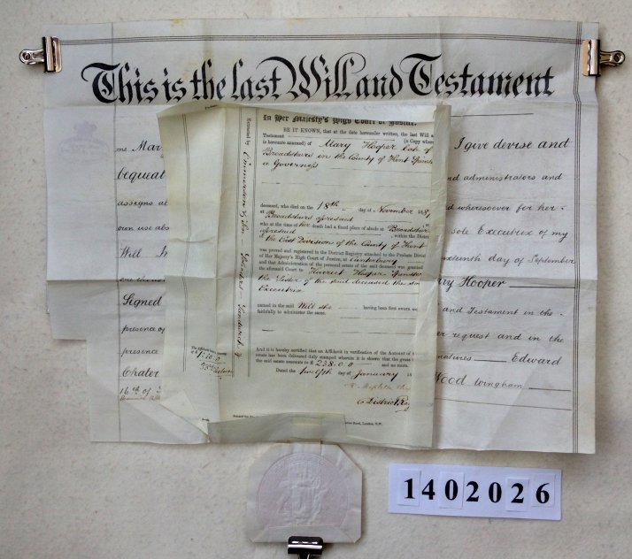 Mary HOOPER of Broadstairs, Kent - Governess SUBJECT The largest sheet of the pair is the probate copy of Mary Hooper's Will in which she leaves everything to her sister Harriet Hooper. The second sheet is the grant of probate which gives the value of her estate as £238.. | |||||||||||
