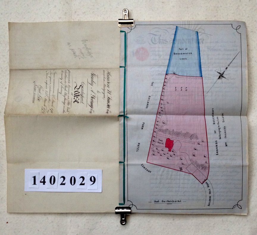 Hanson Merry FRASER of Ravendale, Weybridge, Surrey - Esquire Martha Elizabeth BIRD - the wife of William Barrott Montford BIRD of Eartham, Sussex - Esquire Aline Cecilia PAYNE - the wife of Charles Robert Salisbury PAYNE of Blunham House, Sandy, Bedfordsire - Esquire Stanley Alexander YOUNG of 41 Coleman Street, City of London - Esquire SUBJECT Hanson Fraser is granting a 14 year Lease on property in the Parishes of Walton and Weybride, Surrey, to Stanley Young. It consists of a house called 'The Vale' in a plot of 3 acres of land accessed by Oatlands Vale Road, leading to it from the South East. Immediately to North West is Broadwater Lake and the property has certain rights over the lake as created by a Deed of Covenant made in 1847. The property is mortgaged to Martha Bird and Aline Payne who are included in the document to indicate their agreement to it. | |||||||||||