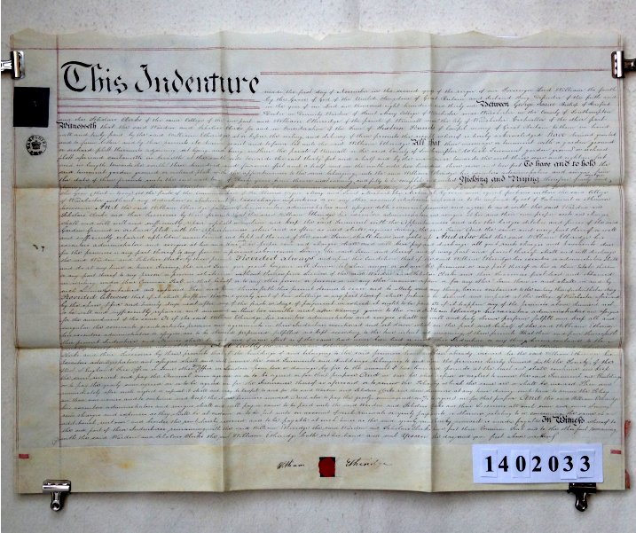 George ISAAC of Winchester, Hampshire - Bishop of Hereford and Warden of St Mary College, Winchester William ETHERINGTON of Winnall, Hampshire - Victualler SUBJECT The Warden, Scholars and Clerks of St Mary College, Winchester, are granting a Lease on property in Winnall, Hampshire, to William Etherington. The property consists of a messuage with garden or orchard and loft, and has a boundary of the "main River" towards the West of 318 feet. The lease is for 30 years at a rent of 10/-d per annum. There are two copies of this Document - the Lease and the Counterpart Lease. The latter is signed and sealed by William Etherington; the former is unsigned. They are for sale separately, each at the price shown above. The Counterpart Lease has a note added on the cover that "The Premises became the Dean and Chapter by Act of Parliament passed 12 July 1837". | |||||||||||