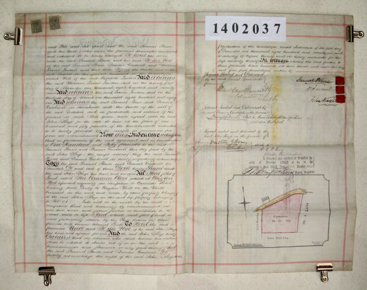| Parchment : 2 pages 31cm x 47cm with 3 wax seals, 3 signatures, revenue stamps and plan of the property. A second Indenture of 27/2/1883 has been added on the back. | |||||||||||