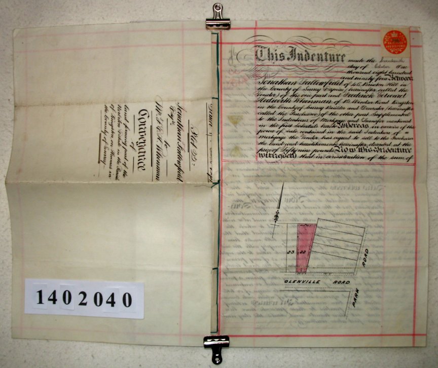 | Parchment: 3 sheets 26cm x 40cm with revenue stamp, 2 signatures and seals. Outline plan of the property on first sheet. | |||||||||||