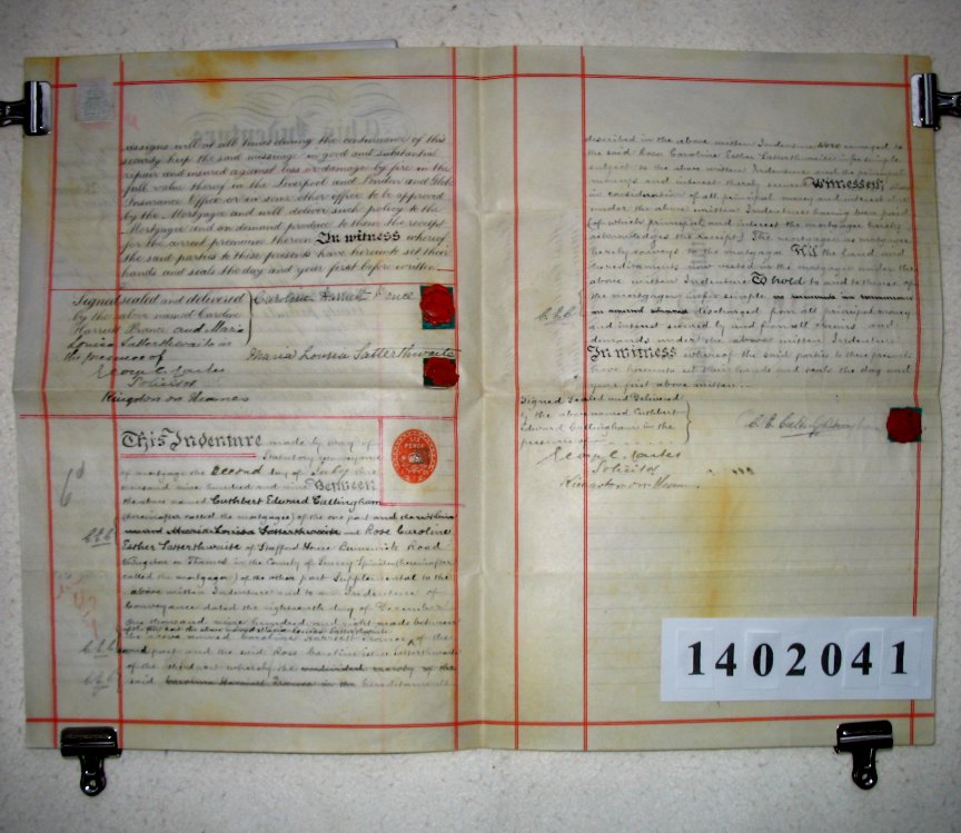 Caroline Harriett PRANCE of Stafford House, Brunswick Road, Kingston upon Thames, Surrey - Spinster Maria Louisa SATTERTHWAITE of Stafford House, Brunswick Road, Kingston upon Thames, Surrey - Spinster Cuthbert Edward CALLINGHAM of Herschell, Saint Leonards Road, Claygate, Surrey - Surveyor. ADDITIONAL PARTY to the Indenture of 2/7/1909 Rose Caroline Esther SATTERTHWAITE of Stafford House, Brunswick Road, Kingston upon Thames, Surrey - Spinster SUBJECT Caroline Prance and Maria Satterthwaite are mortgaging property in Norbiton, Surrey, to Cuthbert Callingham for £90. It is a house known as Eton Lodge, Glenville Road, Norbiton. The Second Indenture of July 1909 records that, in the meantime, Caroline Prance has sold her share of the property to Rose Satterthwaite, It then tells us that the mortgage has been repaid and the mortgaged property is being reconveyed to Maria and Rose Satterthwaite. | |||||||||||