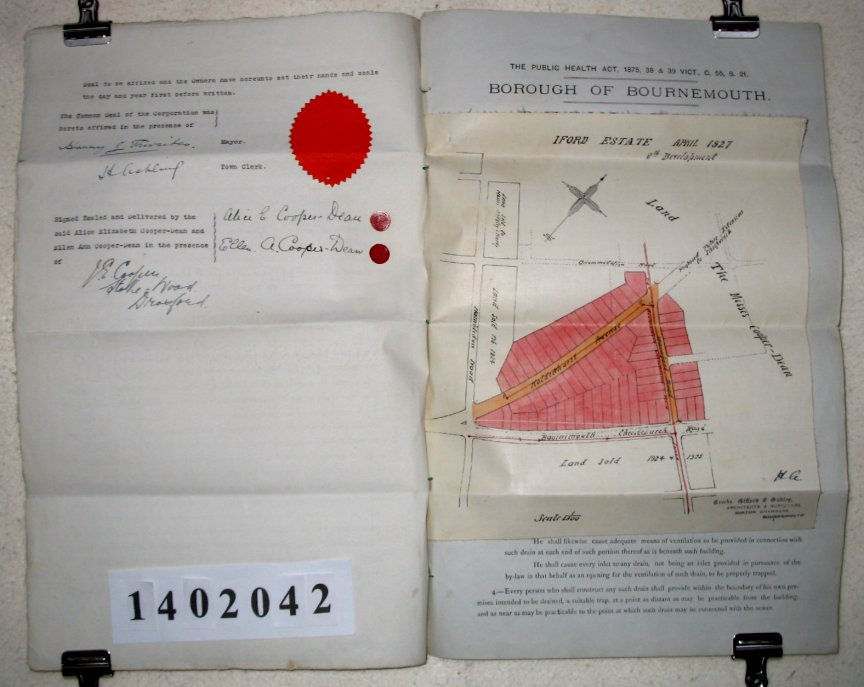 The Mayor and Burgesses of the Borough of Bournemouth Alice Elizabeth COOPER-DEAN of Stokewood, Droxford, Hampshire - Spinster Ellen Ann COOPER-DEAN of Stokewood, Droxford, Hampshire - Spinster SUBJECT We are told that the two ladies own a large plot of building land in Bournemouth. (The plan suggests that it will be divided up for the construction of over 70 houses). The plot is to the West of the Bournemouth - Christchurch Road and is bounded by Holdenhurst Avenue and Warnford Road. This agreement is to allow them to lay private sewers for the development along the various roads and to connect these sewers to the public sewers in Bournemouth. | |||||||||||