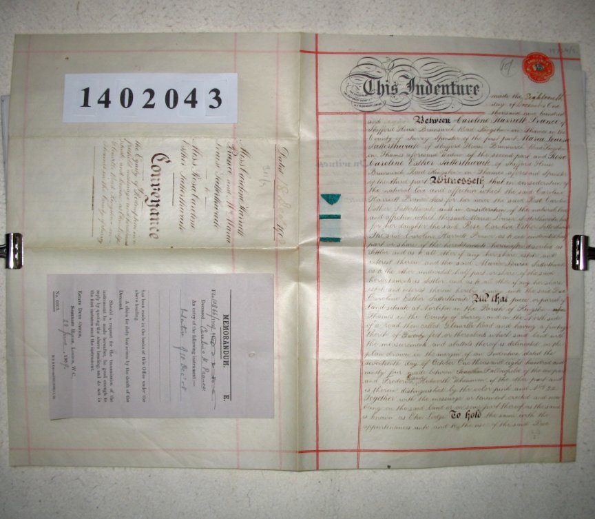 Caroline Harriett PRANCE of Stafford House, Brunswick Road, Kingston on Thames, Surrey - Spinster. Maria Louisa SATTERTHWAITE of Stafford House, Brunswick Road, Kingston on Thames, Surrey - Spinster. Rose Caroline Esther SATTERTHWAITE of Stafford House, Brunswick Road, Kingston on Thames, Surrey - Spinster. SUBJECT We are told that Caroline Prance and Maria Satterthwaite each own half shares in a property known as Eton Lodge, Glenville Road, Norbiton, Surrey. They are now giving it to Rose Satterthwaite who is the daughter of Maria and the niece of Caroline Prance. A paper memorandum is attached dated 28/6/1909 which states that Caroline Prance has died and that death duties will arise. | |||||||||||