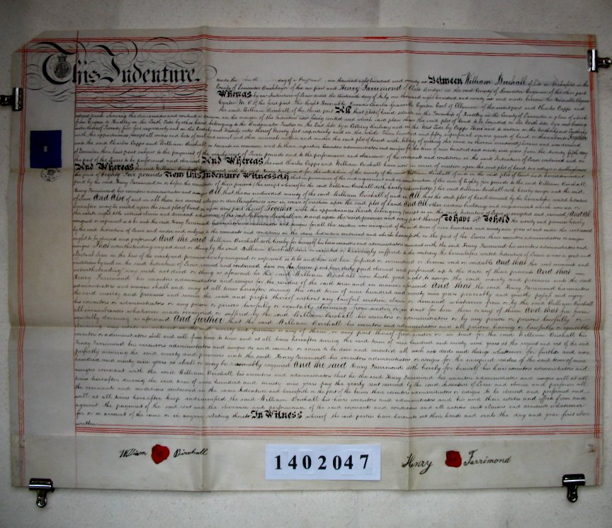 | Parchment : 1 sheet 77cm x 59cm with revenue stamps, 2 signatures and seals. | |||||||||||