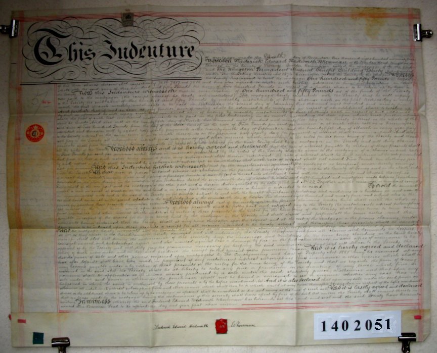 | Parchment: 1 sheet 70cm x 57cm with revenue stamp, 1 signature and seal. A second indenture of 1895 has been added on the back. | |||||||||||